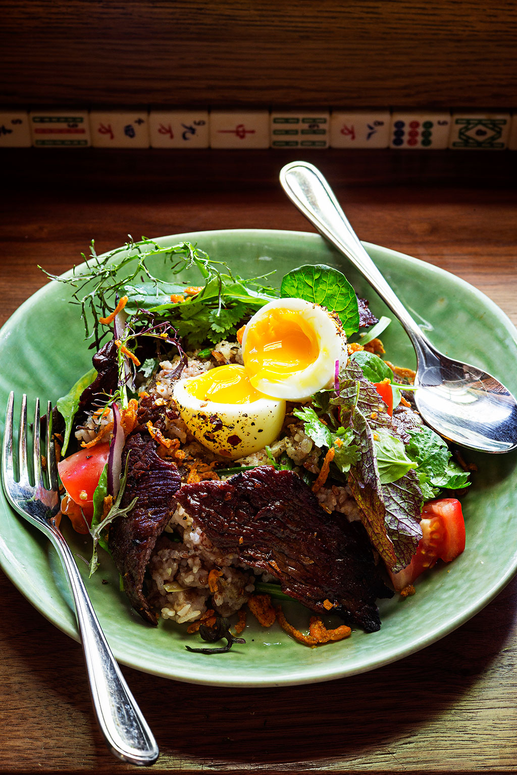 Dried beef with fresh herbs, garlicky rice, and a coddled egg at Bad Saint. Photograph by Scott Suchman.