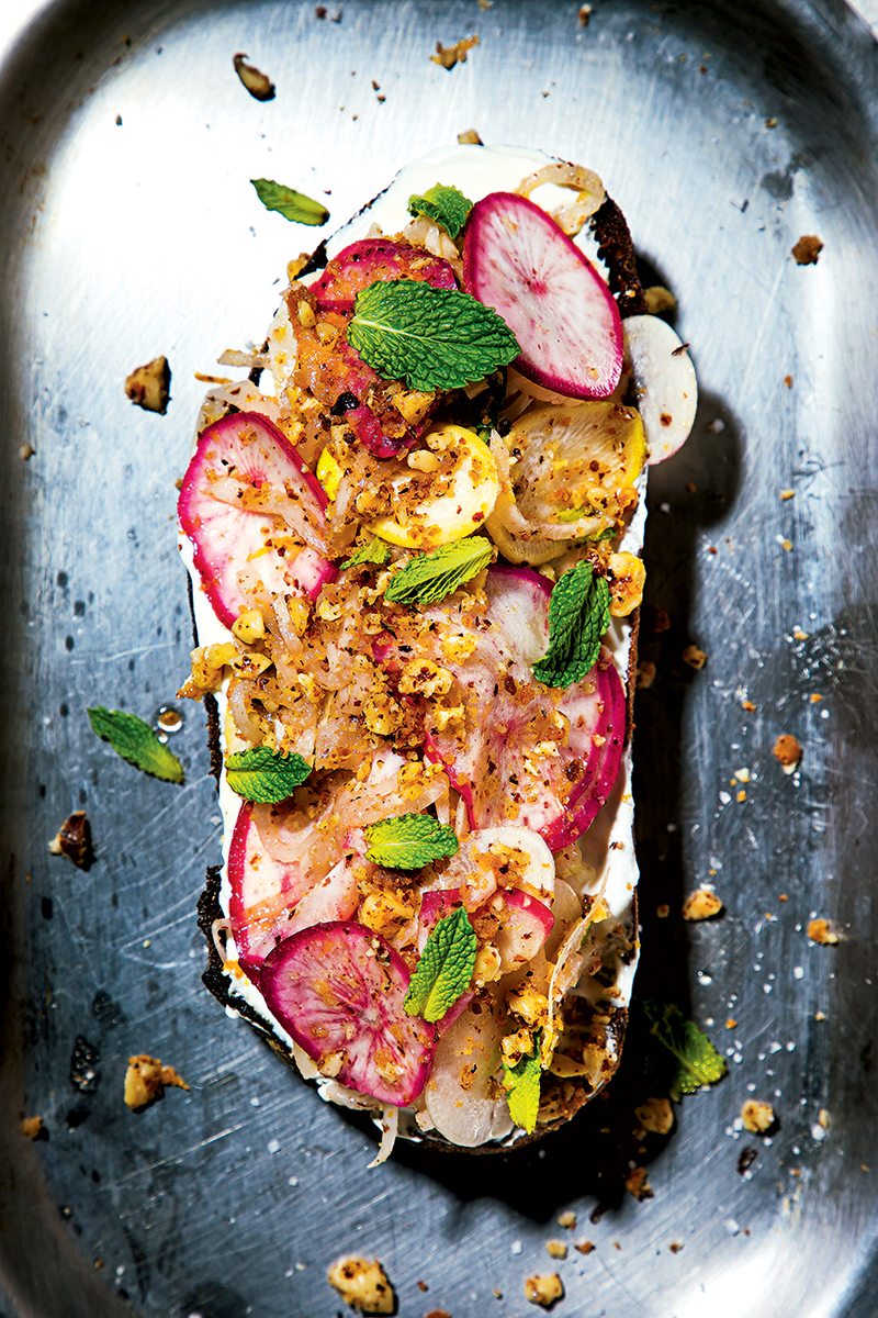 At Tail Up Goat, all the bread is made in-house, including the brown-rice variety used for toast with Greek yogurt, turnips, hazelnuts, and mint. Photograph by Scott Suchman.