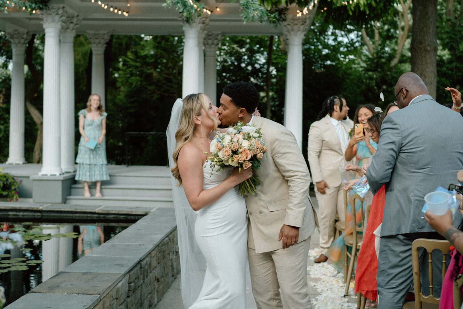 Weddings This Wedding Combined Candles, String Lights, and Pastel Colors for an Intimate Summer Dinner Vibe Tables framing a lily-pad-filled water feature and a "Just Married" cake were two of the highlights. Summer Wedding, real wedding | 3 months ago
