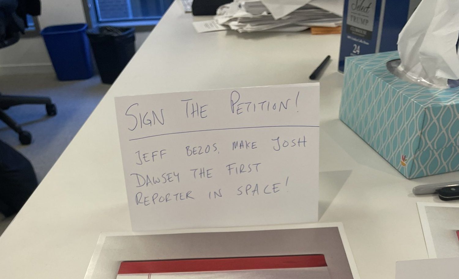 News & Politics No, David Fahrenthold Is Not Really Trying to Send Josh Dawsey Into Space The joke between the Washington Post reporters began circulating on Twitter this week. The Washington Post, Blue Origin, David Fahrenthold, Josh Dawsey | Nov 11, 2021