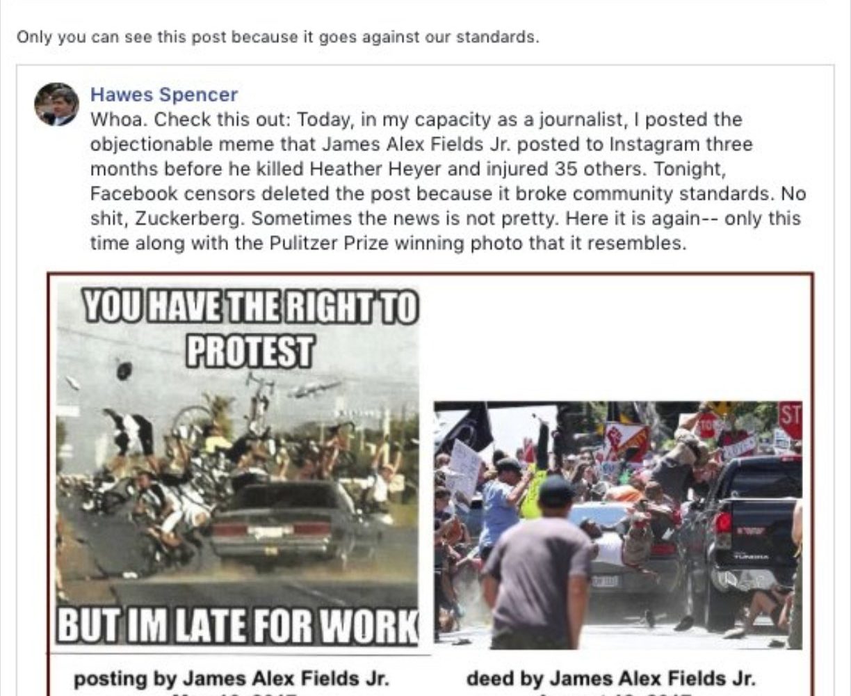News & Politics Facebook Blocks Charlottesville Journalist Who Reported on Accused Killer’s Meme Hawes Spencer showed a meme that James Alex Fields Jr. had shared on Instagram. Now he's unable to post on his account. Media, Facebook, Charlottesville, James Alex Fields Jr. | Dec 1, 2018