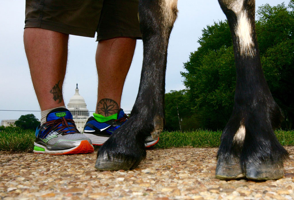 News & Politics “I’m the Dang Goat’s Pack Animal,” Says Man Walking Across America With Goat Steve Wescott has walked from Washington to Washington. Yeah, that's his goat. Local News, News, National Mall, Goat | Aug 10, 2016