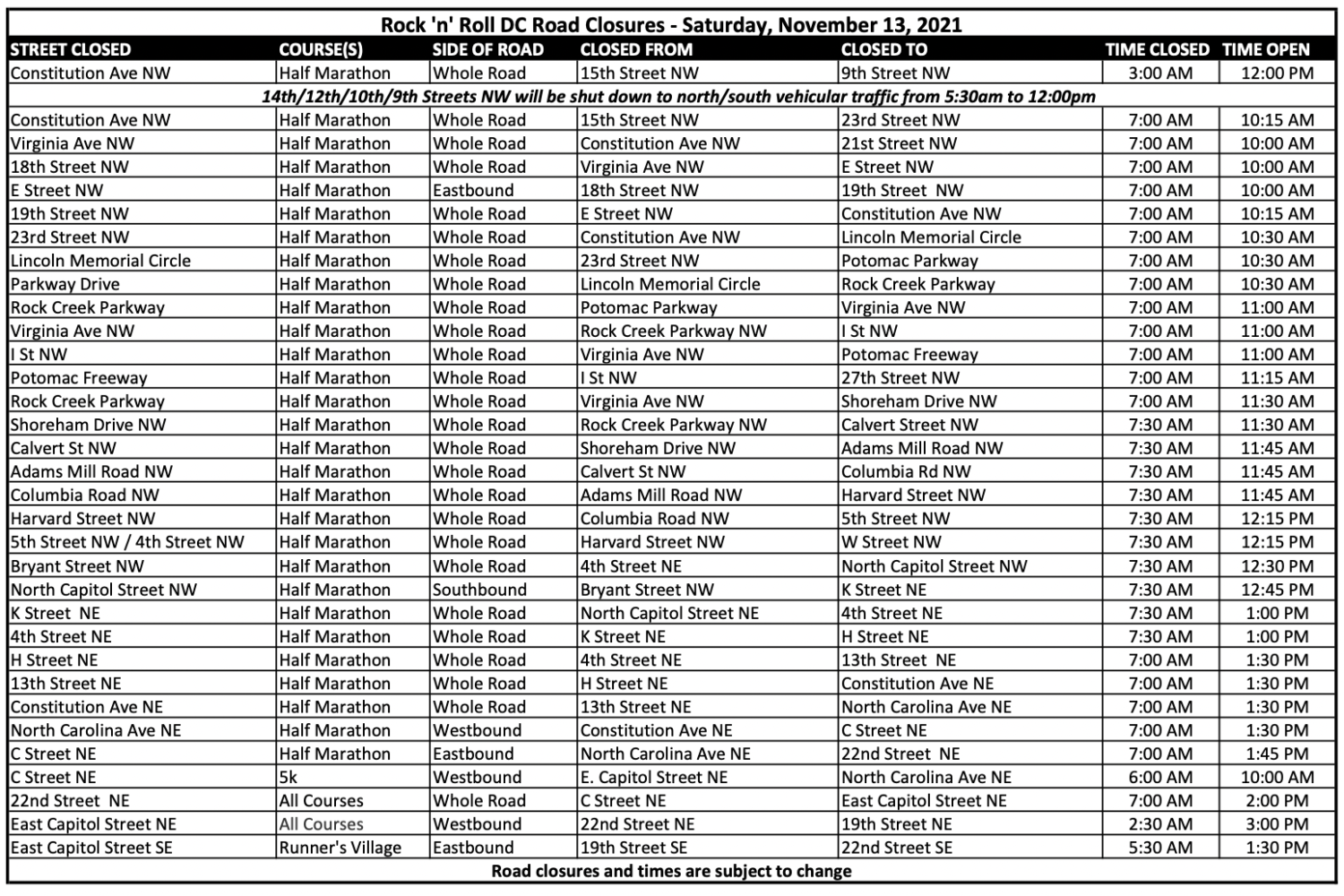 News & Politics These Are the DC Street Closures for Saturday’s Rock ‘N’ Roll Half Marathon and 5K The several restrictions start early in the morning and run until the afternoon. Road Closures, Parking, 5K, Rock 'n' Roll Marathon | Nov 12, 2021
