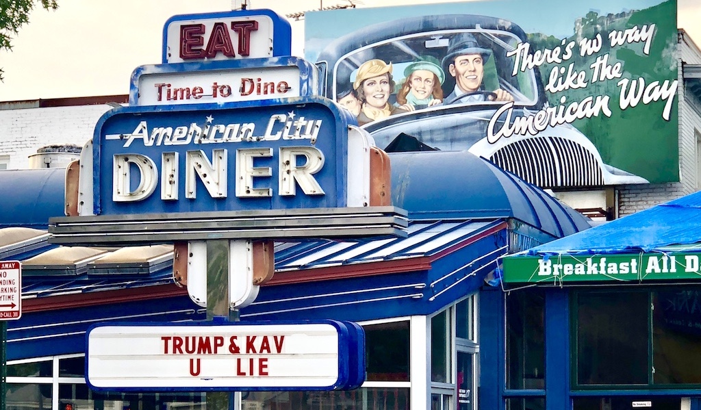 Food | News & Politics DC Diner Trolls Kavanaugh Along His Route Home "Trump & Kav U Lie" says the sign at American City Diner on Connecticut Avenue. Brett Kavanaugh, Steve Salis, American City Diner | Sep 26, 2018