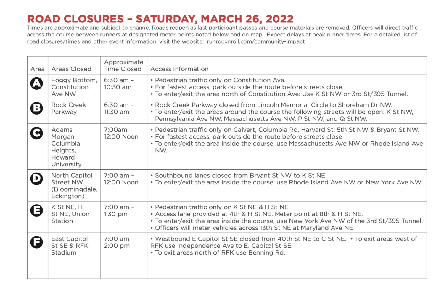 News & Politics | Things to Do MAP: DC Street Closures for Saturday’s Rock ‘n’ Roll Half Marathon and 5K The restrictions will last throughout the morning and afternoon. Road Closures, street closures, Rock 'n' Roll Marathon | Mar 22, 2022
